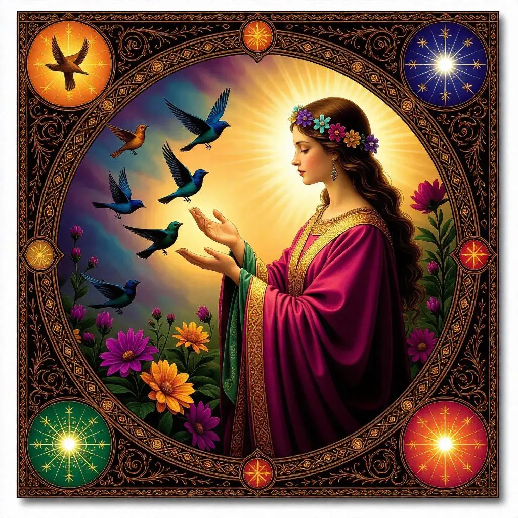 Create a healing, motivational masterpiece with Vivago.ai’s AI art generator. Blend ancient global symbols into a vibrant medieval-style painting of a woman releasing birds—capturing universal hope and renewal. Ethereal colors, timeless elegance, and cultural motifs merge for a wordless, soulful visual journey. Craft unique, meaningful art inspired by cosmic harmony and emotional freedom.