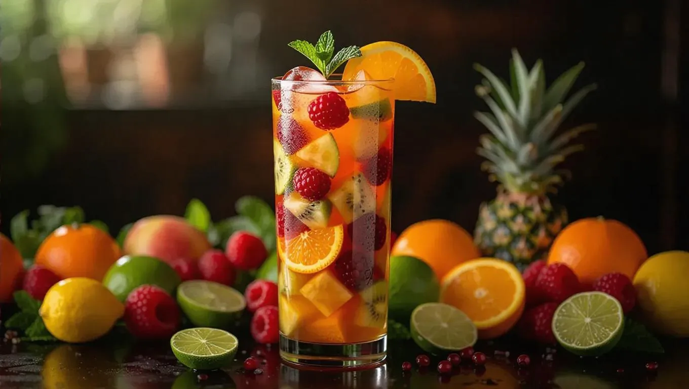 Craft vibrant AI-generated visuals of a refreshing fresh drink with assorted fruits in a tall glass. Transform text prompts into crisp, colorful imagery using advanced AI tools and curated effects for professional-grade creative results.
