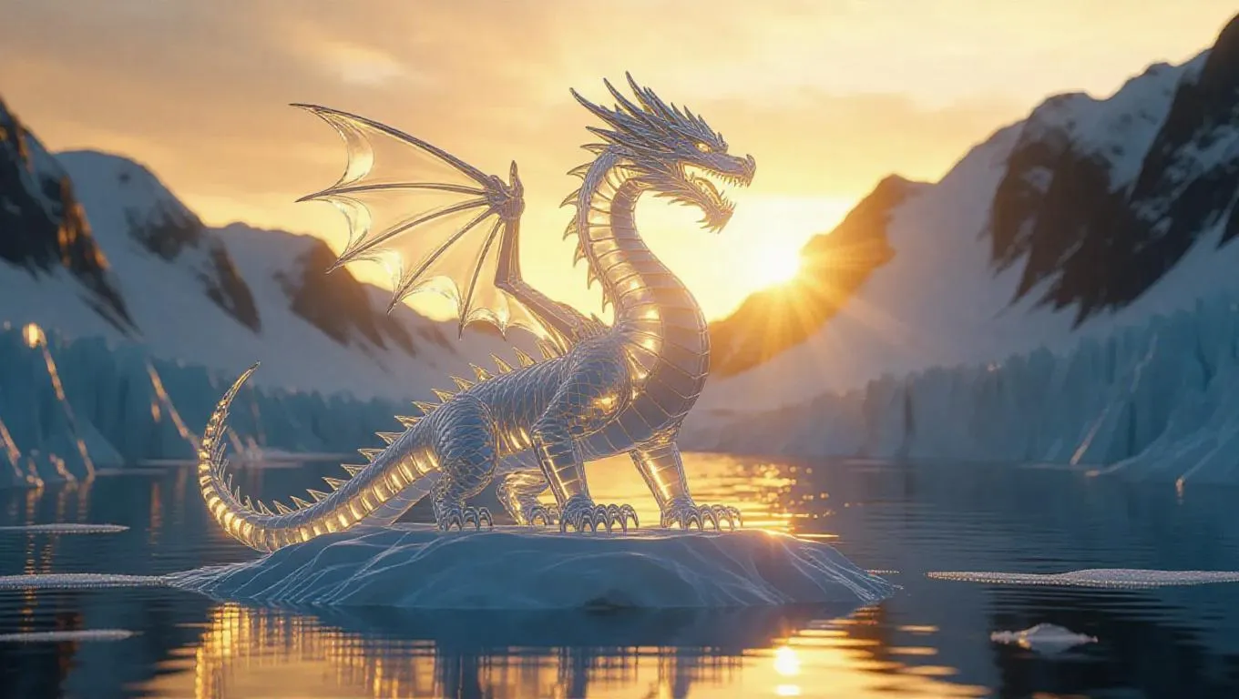An imposing ice sculpture of a dragon standing tall, illuminated by the golden rays of the setting sun, mid-glacier, 3D render, high quality, crystalline details, ethereal glow, icy reflections, dramatic shadows.