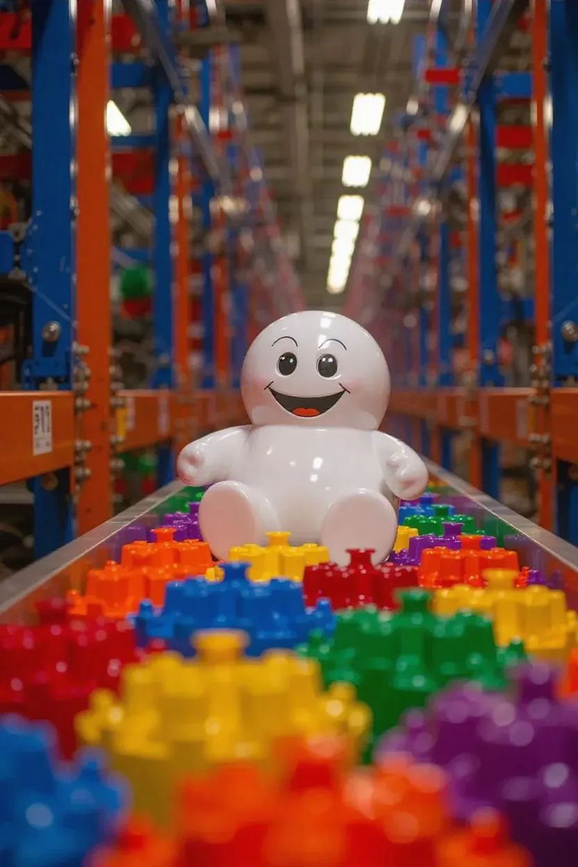 Casper, the friendly ghost toy, nestled among a colorful array of toys in a bustling toy factory, surrounded by whimsical machinery and vibrant assembly lines, capturing the magic of creation and play.