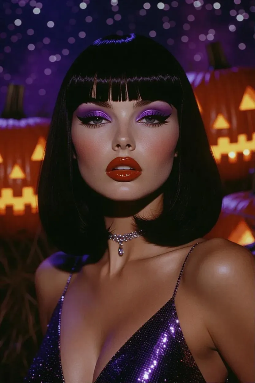 Retro-futuristic pin-up portrait of a glamorous woman, sleek black hair with blunt bangs, bold cat-eye eyeliner, purple glitter eyeshadow, glossy red lips, wearing a shimmering silver sequin gown, posing in a surreal graveyard with glowing pumpkins and starry night sky, cinematic 1950s Hollywood glamour mixed with gothic fantasy, dramatic lighting, glossy magazine aesthetic, highly detailed.