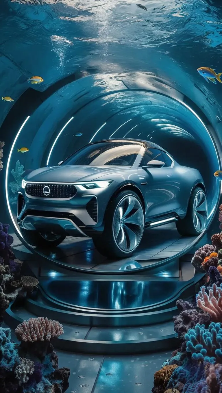 Generate a hyper-realistic 3D scene of a futuristic spherical car with magnetic wheels gliding through an illuminated underwater tunnel. AI-powered tools create shimmering reflections, radial motion effects, and vivid marine life details for professional CGI renders. Transform text prompts into immersive sci-fi visuals with precision.