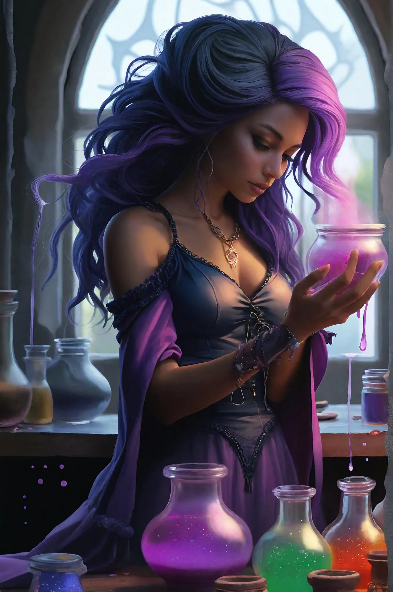 Generate vibrant AI images of a mystical rainbow-haired witch crafting magical potions, blending fantasy and vivid colors. Create enchanting visuals with AI-powered tools for spellbinding artwork, perfect for storytelling, gaming, or digital art. Transform text prompts into professional-grade fantasy scenes effortlessly.