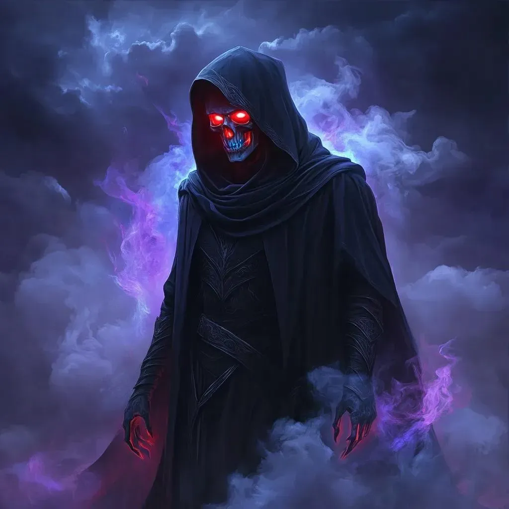 Create a dark fantasy AI portrait of a menacing warlock with a glowing red skull, intense blue eyes, and a shimmering cloak. Set in a mystical realm with smoky ambiance, violet skies, and dramatic lighting. Ideal for realistic fantasy art, vivid color contrasts, and professional-grade AI-generated character visuals.