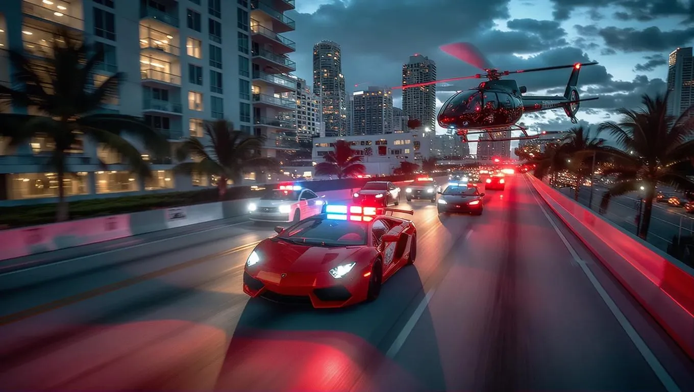Aerial view of a vibrant cityscape 3D helicopter flying above, Miami Fla with a long exposure effect highlighting the movement of traffic a red Lamborghini driving the same direction on 95 S with the traffic ( same direction) through the city very fast 6 police cars with lights on chase. the Lamborghini sports car a 3D helicopter flies overhead the Lamborghini with its police lights shining and glowing lights from buildings, captured with a drone camera. HD 4k very intense theatrical scene of movement