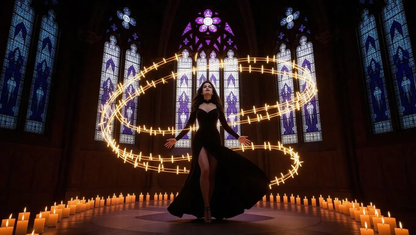 “Wide cinematic shot of a gothic woman standing inside a cathedral made of stained glass. The walls begin to glow and breathe around her — pulsing light through fractured glass, like a living organism. The stained glass bends and cracks inward but suspends in mid-air, swirling around her. Her black dress flows with unseen wind. Dozens of candles light themselves one by one along the edges. Her face is calm but fierce — she is awakening something ancient. The atmosphere is mystical, surreal, divine and eerie.” Style Modifiers: hyperrealistic, magical realism, gothic surrealism, sacred horror, volumetric light, dramatic shadows, floating debris, cinematic choreography