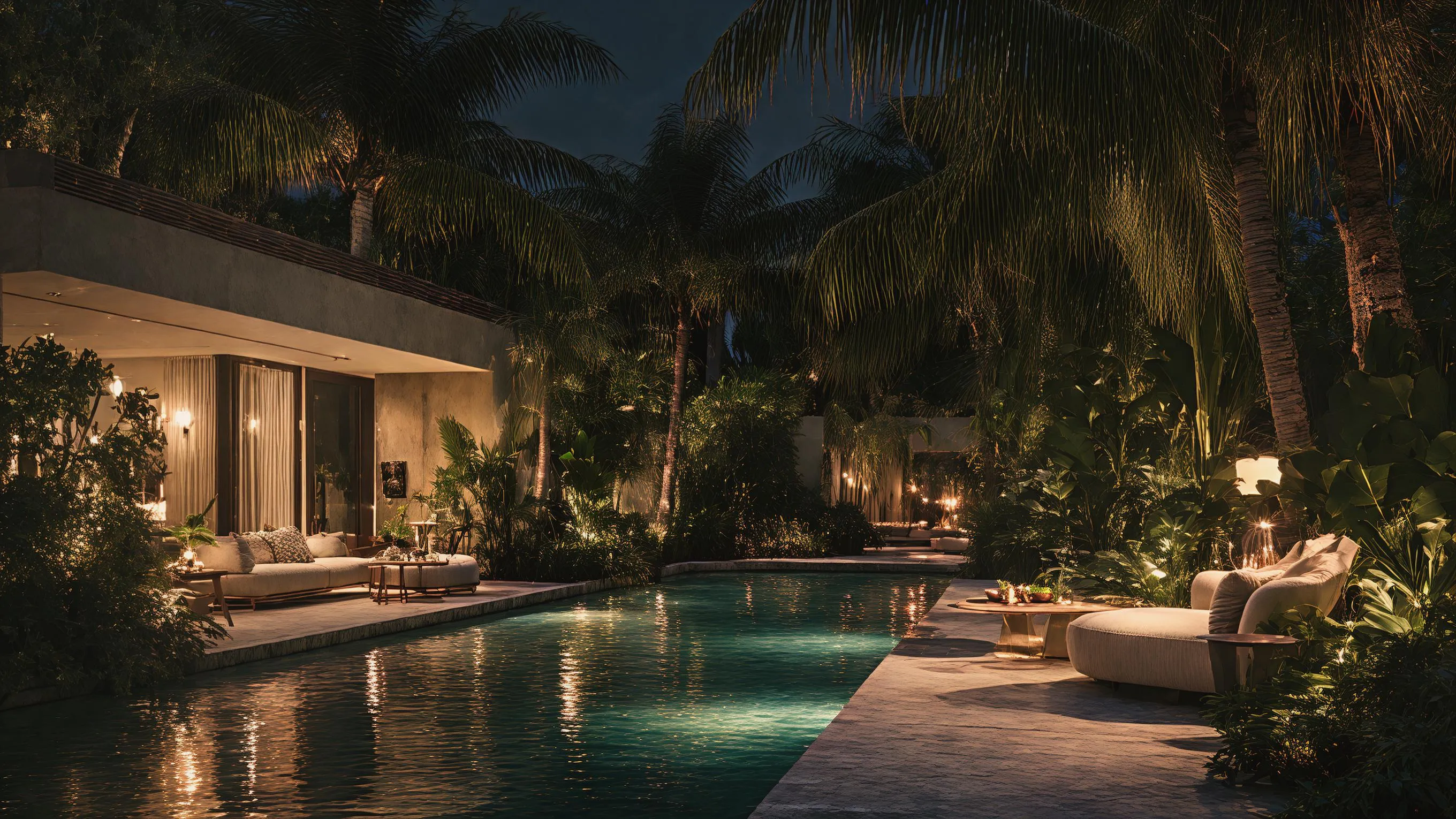 Create a private tropical lounge garden scene at night with Vivago.ai. Generate AI visuals featuring soft ambient lighting, lush palms, designer furniture & calm water reflections. Evoke luxury resort atmosphere & cinematic tropical house vibes. Transform text prompts into stunning AI-generated images.
