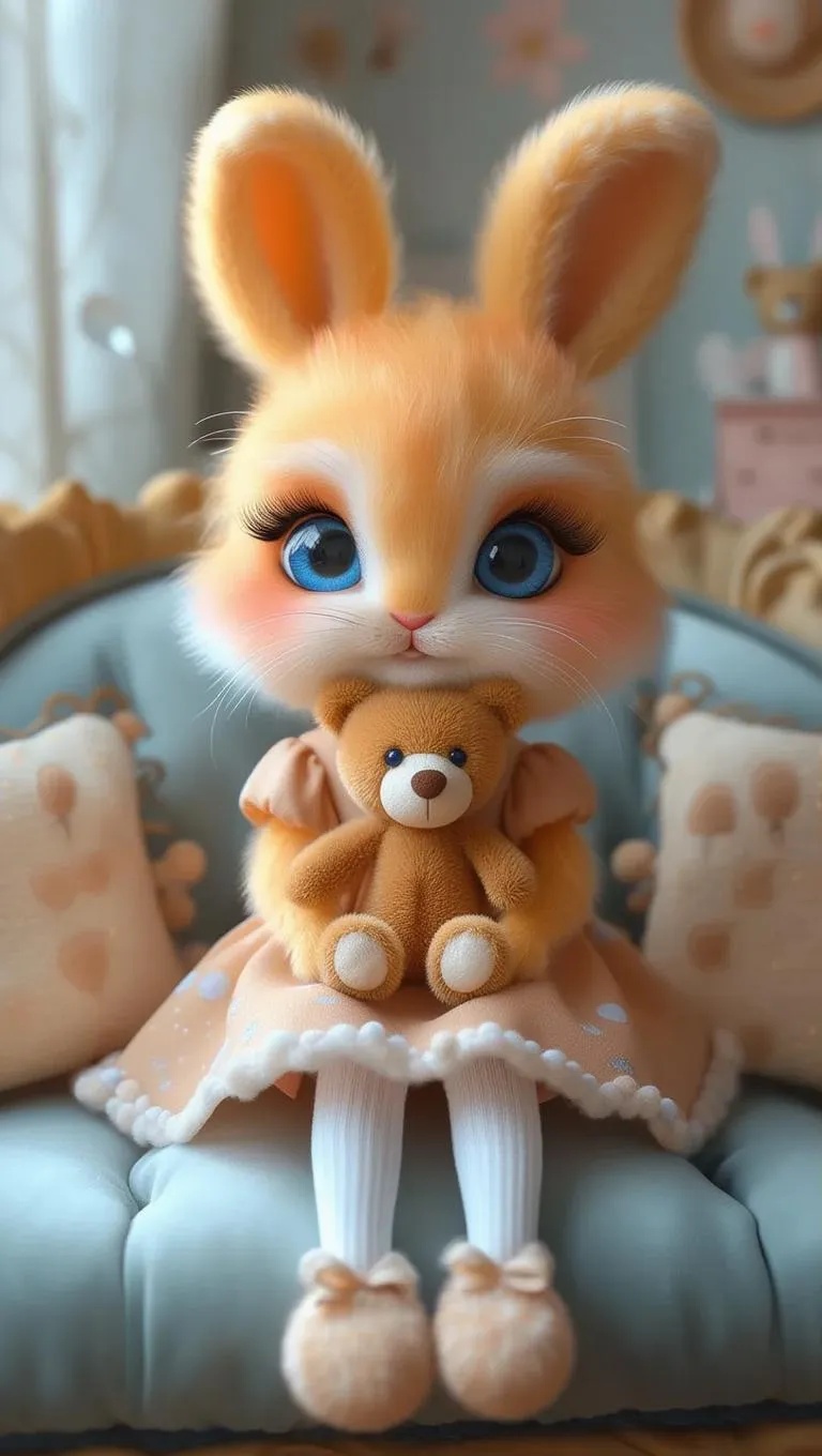 Create a photorealistic cartoon of a tiny orange bunny with blue eyes in a cute dress, holding a teddy bear in a whimsical children's room. Transform text to visuals with vivago.ai's AI image generator for professional-grade character designs, adorable animal art, and enchanting nursery scenes. Perfect for storytelling, kids' content, and fantasy-themed digital art creation.