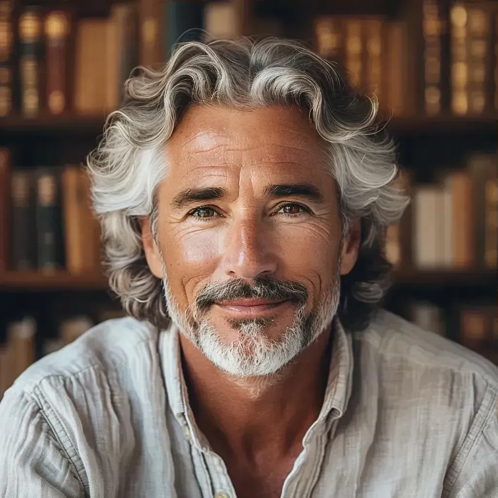 Create an AI-generated wise mentor with white curls in a serene studio. Vivago.ai crafts motivational visuals using calming colors, soft lighting, and personal development books, blending elegance and approachability for professional, engaging spiritual content.