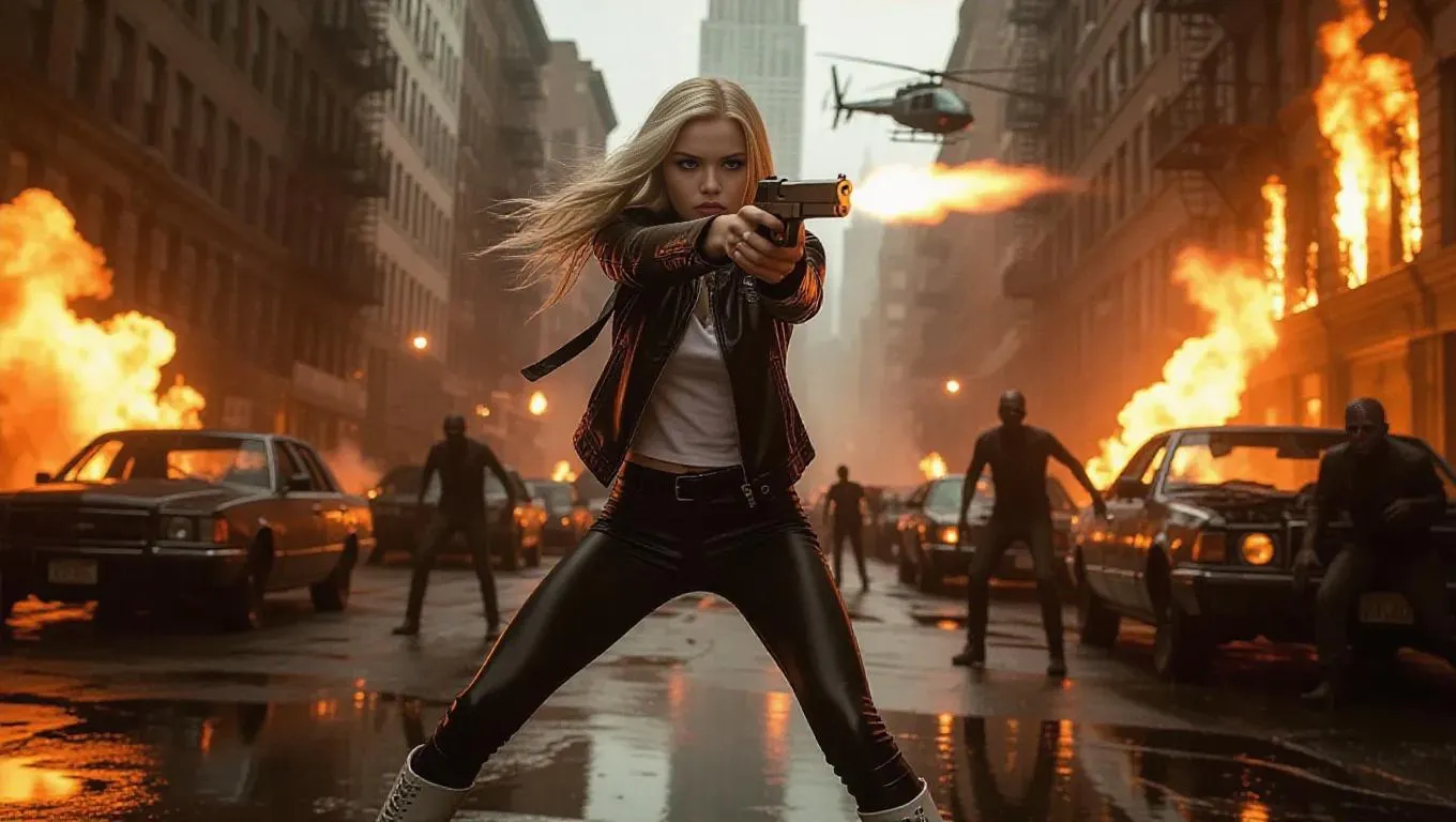 AI-generated realistic post-apocalyptic scene: Confident woman in leather combat gear aims a gun at zombies amid fiery explosions, burning cityscape, helicopter chase, and torrential rain. Craft hyper-detailed apocalyptic visuals with VivaGo.ai's AI image generator for dynamic action and immersive storytelling.