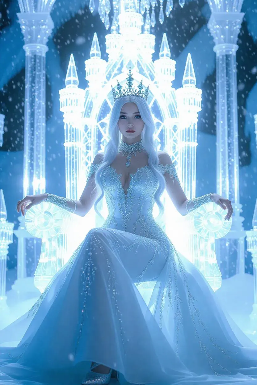 Elegant ice queen, seated majestically on an intricate ice throne within her luminous ice castle. Her flowing silver hair and shimmering icy gown exude a sensual, ethereal beauty. Adorned with a beautiful bug crystal crown. The castle’s crystalline walls reflect the soft, blue glow of enchanted lights, creating a mesmerizing, otherworldly atmosphere. Raining snow inside, beautiful long crystal chandelier casting a magical luminescence.