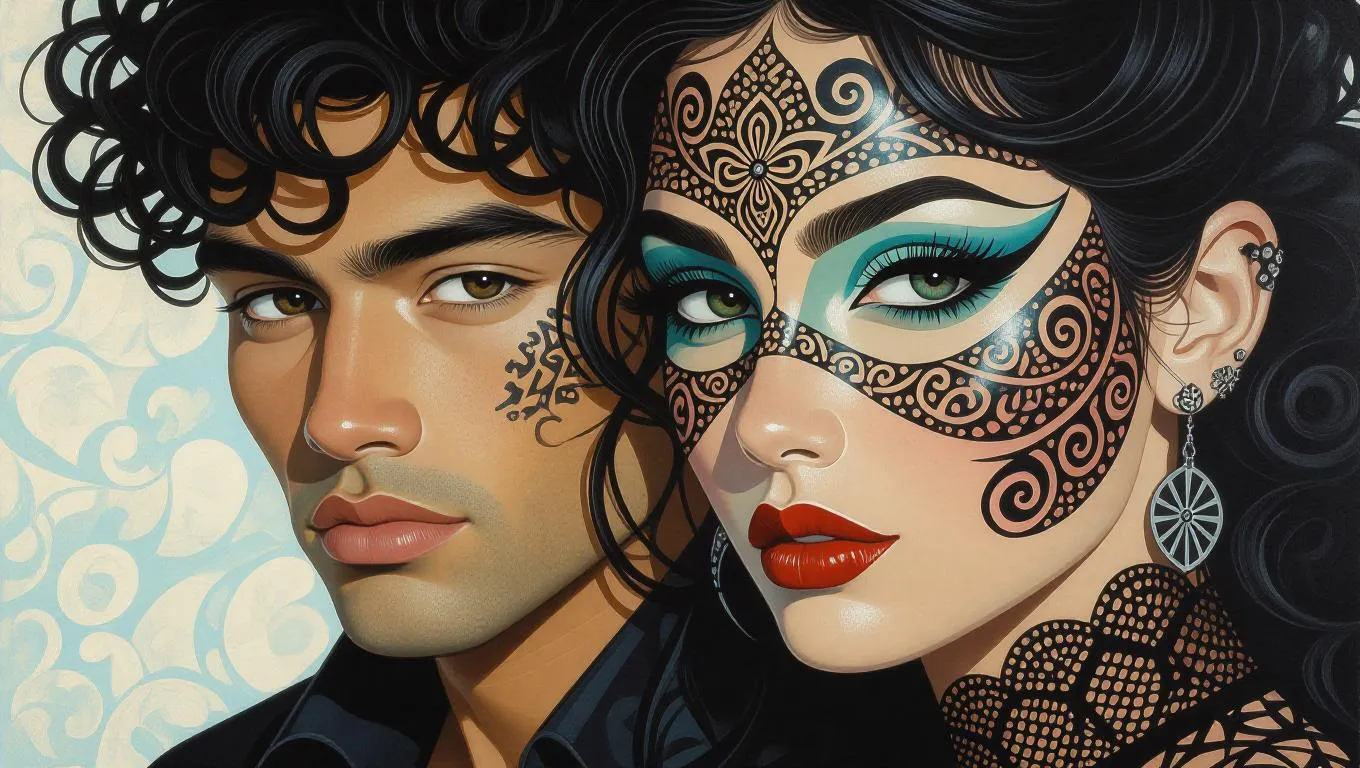 fractal shoal of black lace Deco: close up face to a young humans Maori punk couple in a Vogue sharpen black psychedelic atmosphere cover:1 under light and shadow in style of a illustration painting, and fun secondary characters in style of Marvel Studio painting , in Arcimboldo painting, in Fashion culture