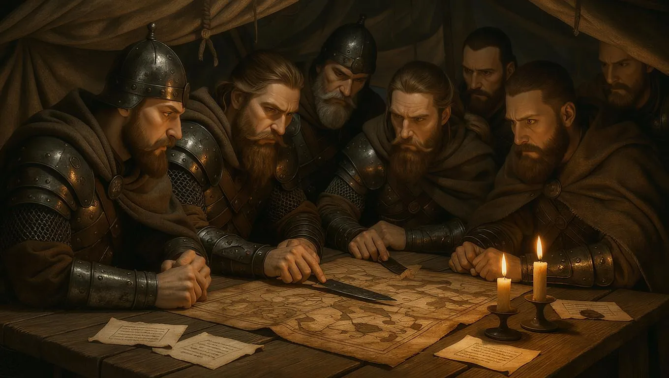 Inside a large tent, a group of Slavic war leaders, clad in armor and cloaks, gather around a leather map on a wooden table. The war leader, holding a knife, points decisively at the center of the map, while the others lean in, engaged in intense discussion. Two candles and several parchments are scattered on the table, casting a warm, soft light that highlights their determined expressions. The tent is dimly lit, with the flickering candlelight adding a sense of urgency and secrecy to the scene. The style is realistic, capturing the gritty, historical atmosphere.