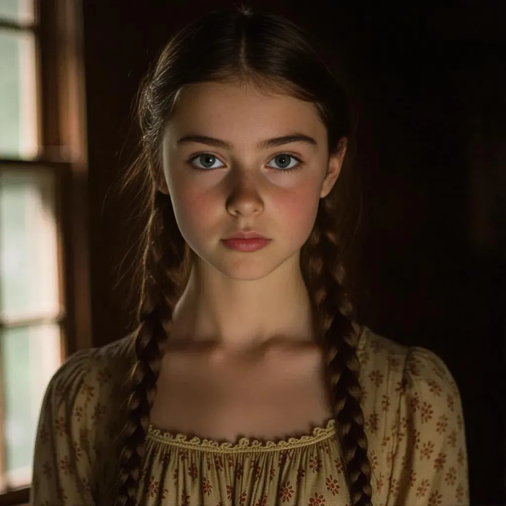 Generate AI portraits of a determined 14-year-old girl with braided dark gold hair in a haunting 1930s scene. Create melancholic lighting highlighting her resolute hazel gaze and fair skin, using rule of thirds composition for professional AI-generated portraits with historical, emotional depth.