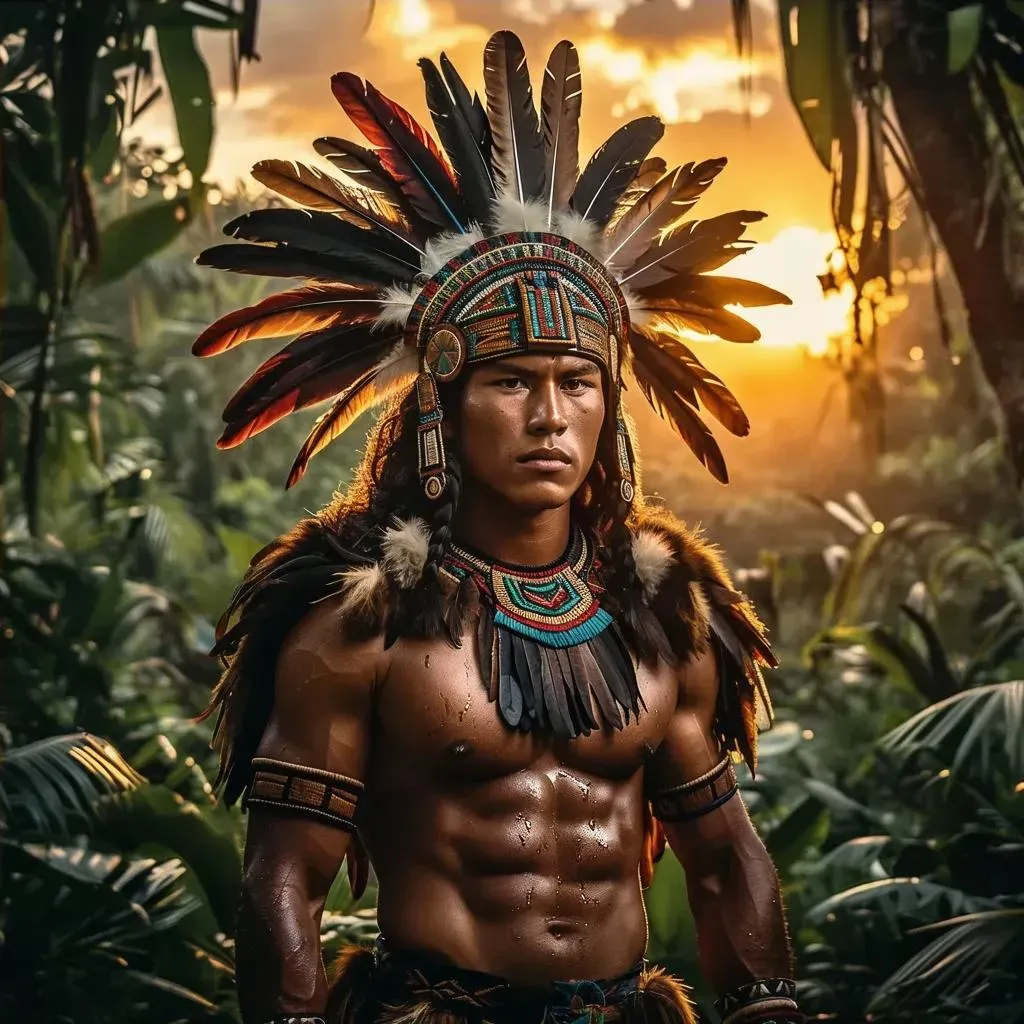 Vivid AI-generated art of a valiant Aztec warrior in feathered armor, standing determined amidst a lush jungle. Golden sunset hues highlight his fierce headdress and chiseled features, embodying courage and adventurous spirit. Rich flora and fauna backdrop enhance this iconic figure, ready for battle. Perfect for dynamic visual storytelling and professional-grade creative projects.