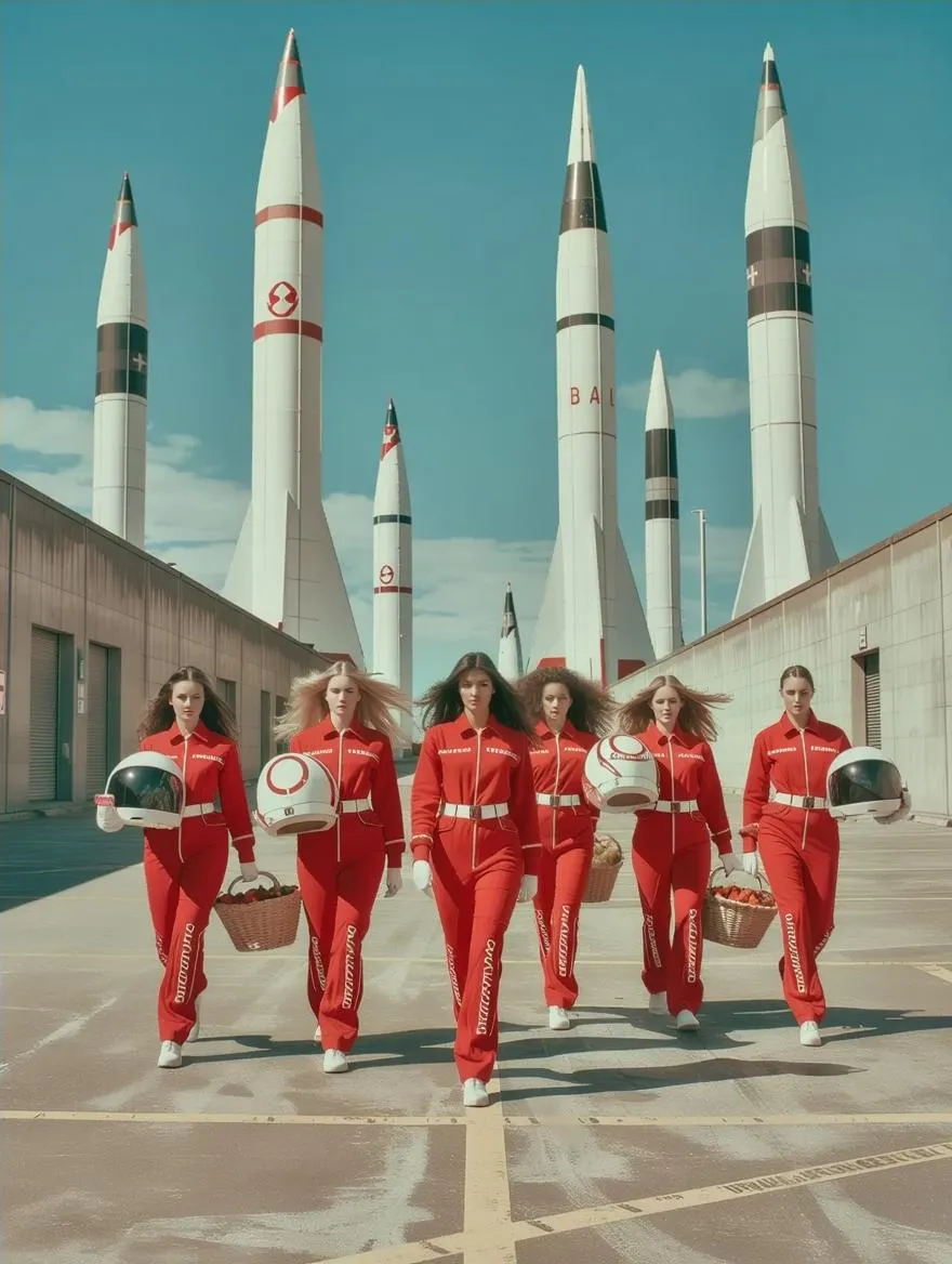 European supermodels in Chokolad Buket-branded red jumpsuits explore a brutalist parking lot with space-age rockets. Cinematic energy, dramatic angles, and surreal glamour blend earthy concrete textures with cosmic elegance. Retro-futurism editorial vibe—Vogue meets high-art, strawberries and space helmets adding whimsical contrast. Harsh shadows, asymmetrical composition, and spontaneous poses evoke iconic unpredictability.