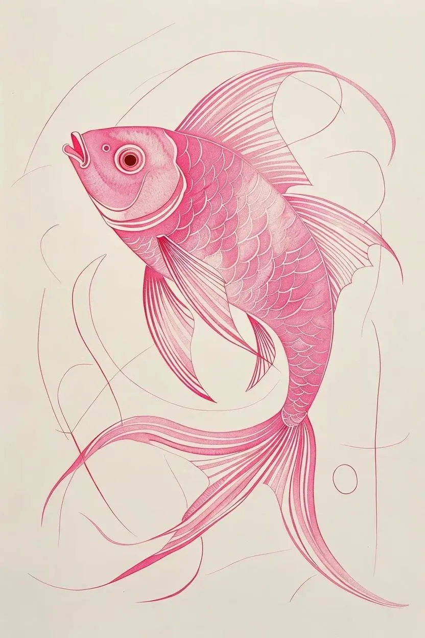 Create a Matisse-inspired line drawing of elegant fish with bold minimalist lines in pink ink on cream paper. AI-generated art combines Henri Matisse's fluid style with striking simplicity, emphasizing clean shapes against a white background for contemporary elegance. Perfect for modern decor or artistic projects.