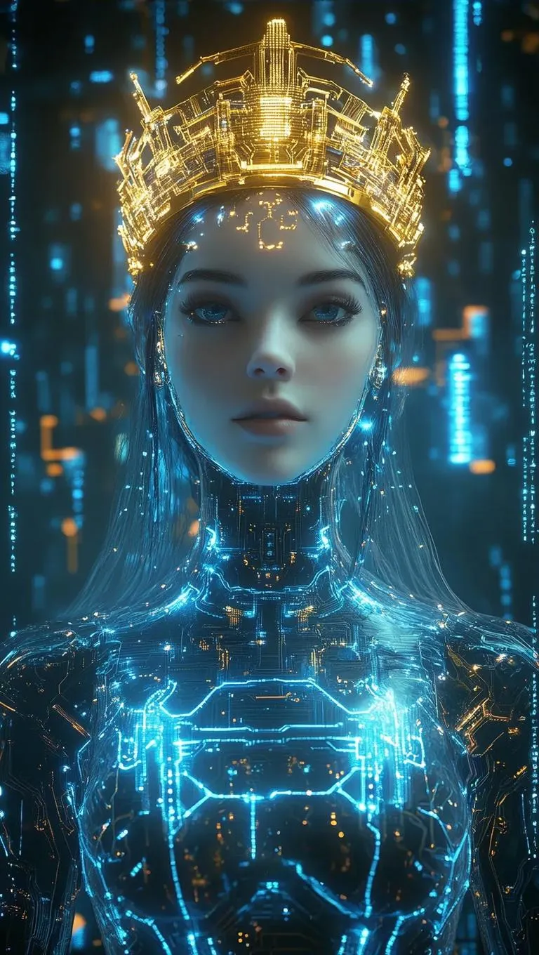 Generate a photorealistic sci-fi AI queen with a semi-transparent body glowing electric-blue neural networks, adorned by a golden cybernetic crown, floating in a dynamic digital matrix. Create ultra-high-resolution 8K futuristic visuals using Vivago.ai's advanced AI image generator for cutting-edge concept art and digital artistry.