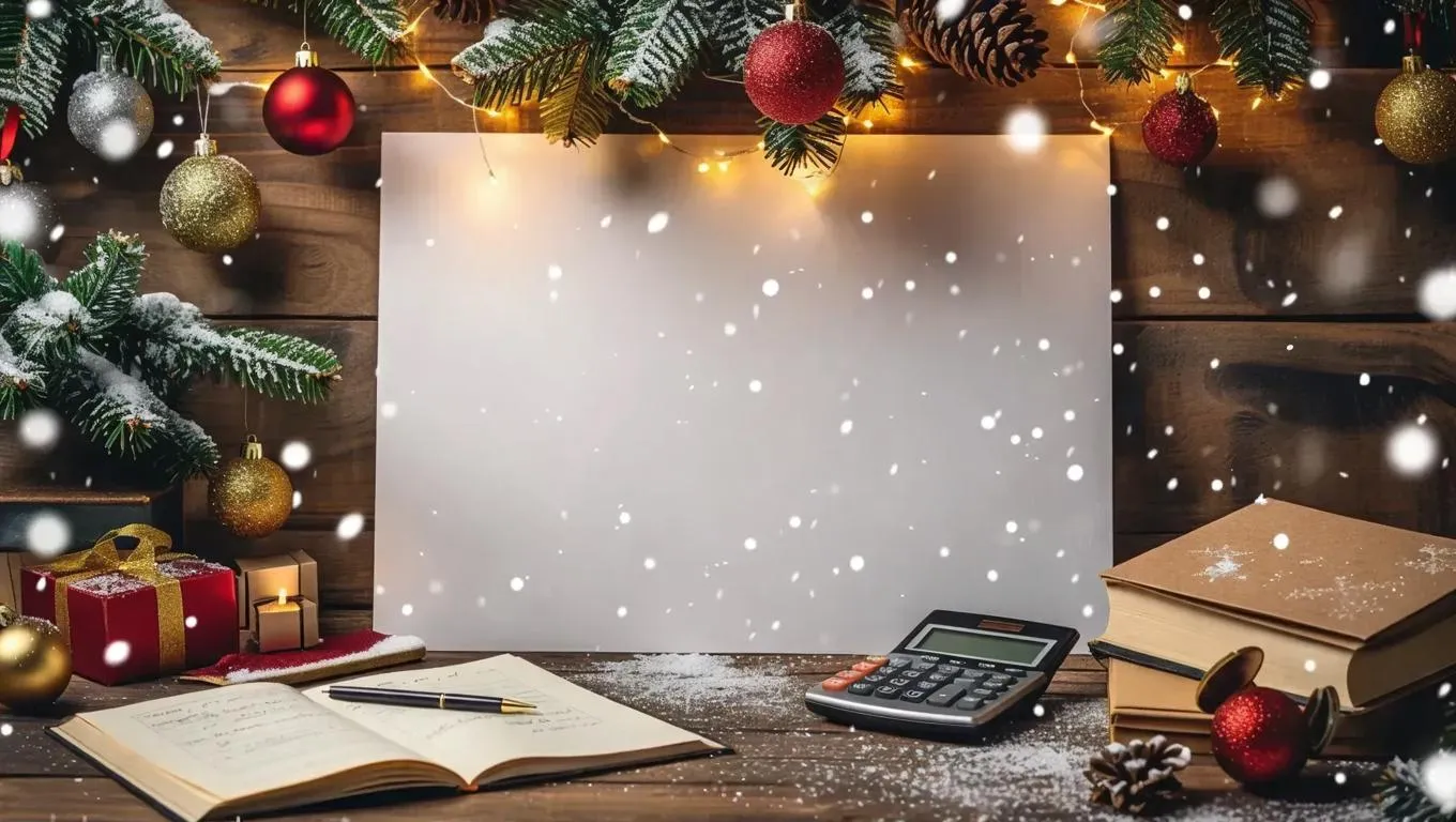 Generate a text-free AI accounting holiday card with festive calculators, spreadsheets, and graphs adorned with Christmas ornaments or New Year's sparkles. Features ample blank space for custom text, blending professional finance visuals with seasonal motifs. Ideal for accountants and firms seeking customizable, AI-designed templates for year-end celebrations.