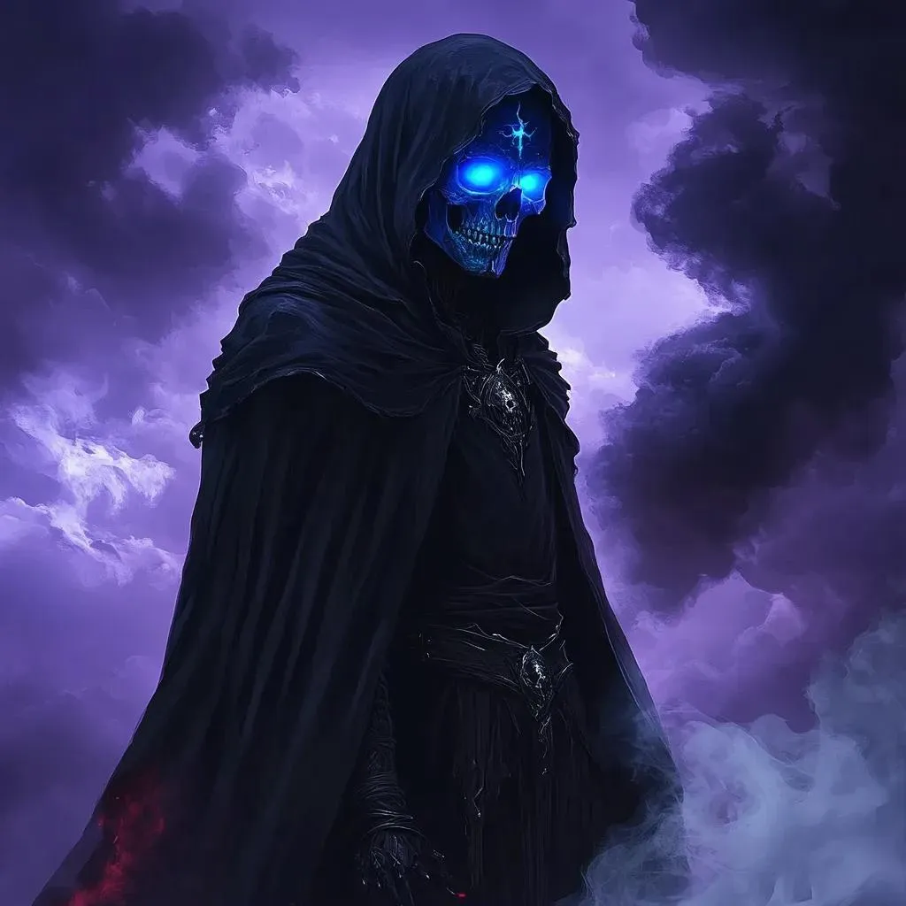 Create a dark fantasy AI portrait of a menacing warlock with a glowing red skull, intense blue eyes, and a shimmering cloak. Set in a mystical realm with smoky ambiance, violet skies, and dramatic lighting. Ideal for realistic fantasy art, vivid color contrasts, and professional-grade AI-generated character visuals.