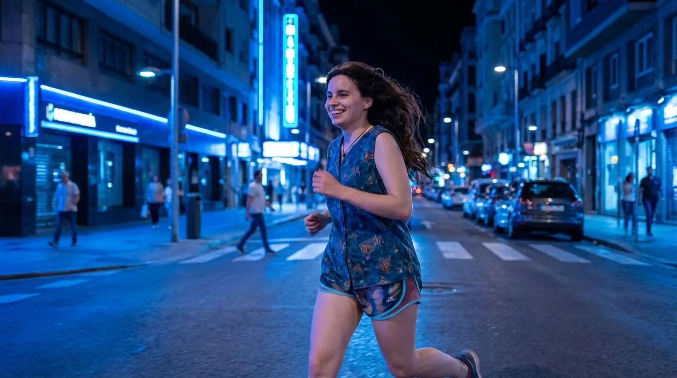 Generate a slim girl with long hair running happily in a vibrant blue-lit futuristic cityscape using VivaGo AI image generator. Create dynamic motion effects with professional AI editing tools for stunning visual content.