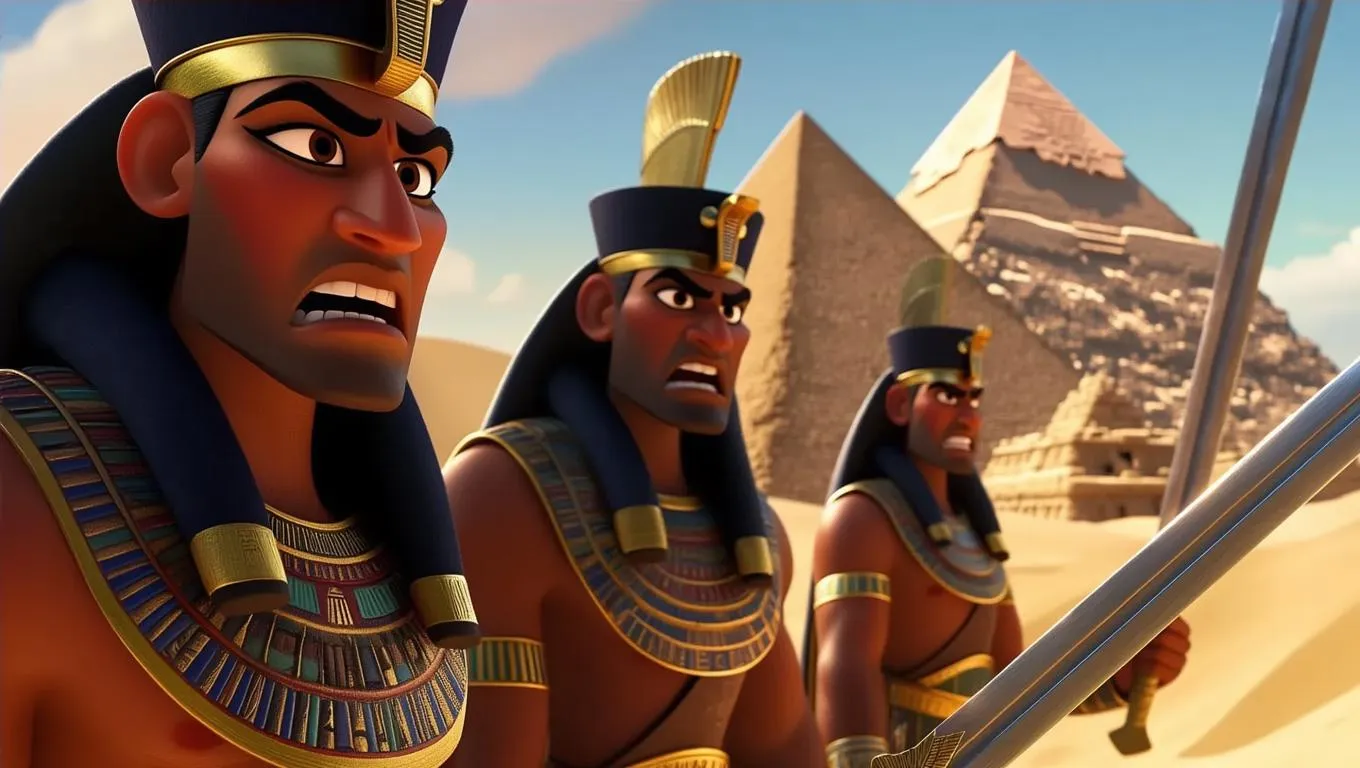 Generate a minimalist Pixar-style scene featuring three angry ancient Egyptian soldiers gripping swords, set against iconic pyramids. This Disney-inspired AI artwork blends vibrant animation with historical themes, perfect for eye-catching digital content. Explore AI image generation tools for playful yet fierce aesthetic creations.