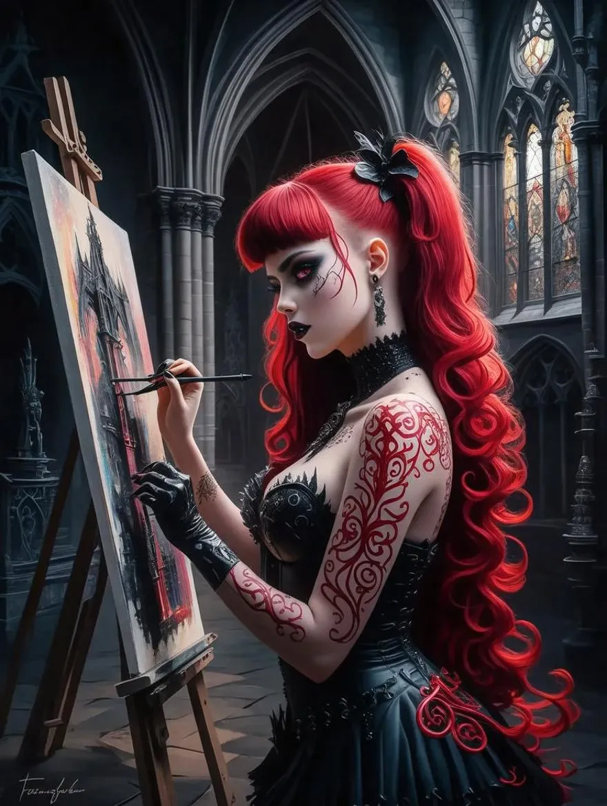 AI-generated Gothic artwork featuring a hyper-realistic Trixie character blending cybergoth, nu-goth, and suburban gothic styles. Vivid red threads, organic body art, and eerie textures adorn her form, set against a haunting cathedral backdrop. Masterful hyper-detailed rendering immerses viewers in this dark, atmospheric fusion of Jinx-inspired aesthetics and Midwest Gothic influences, capturing the essence of contemporary gothic subculture.