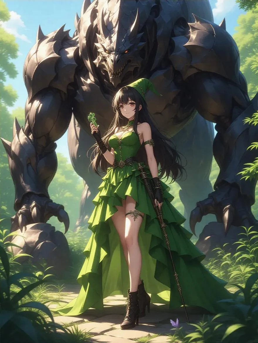 Hiiragi Tsukasa, dressed as vintage fantasy mage in a vegetation-styled dryad dress stands near giant grey roch with strem nearby, lucky star, vn, gradient, anime, light and shadow, ecchi
