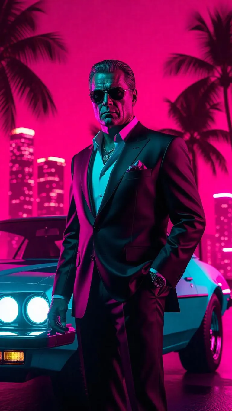 Hyperrealistic image of an older Tommy Vercetti in a modern tropical suit with neon accents, standing beside a sleek futuristic convertible, bathed in bright magenta and teal lights. Vice City skyline in the background, palm trees illuminated with LED lights, cinematic lighting, futuristic-retro vibe, confident expression, realistic textures, moody colors.