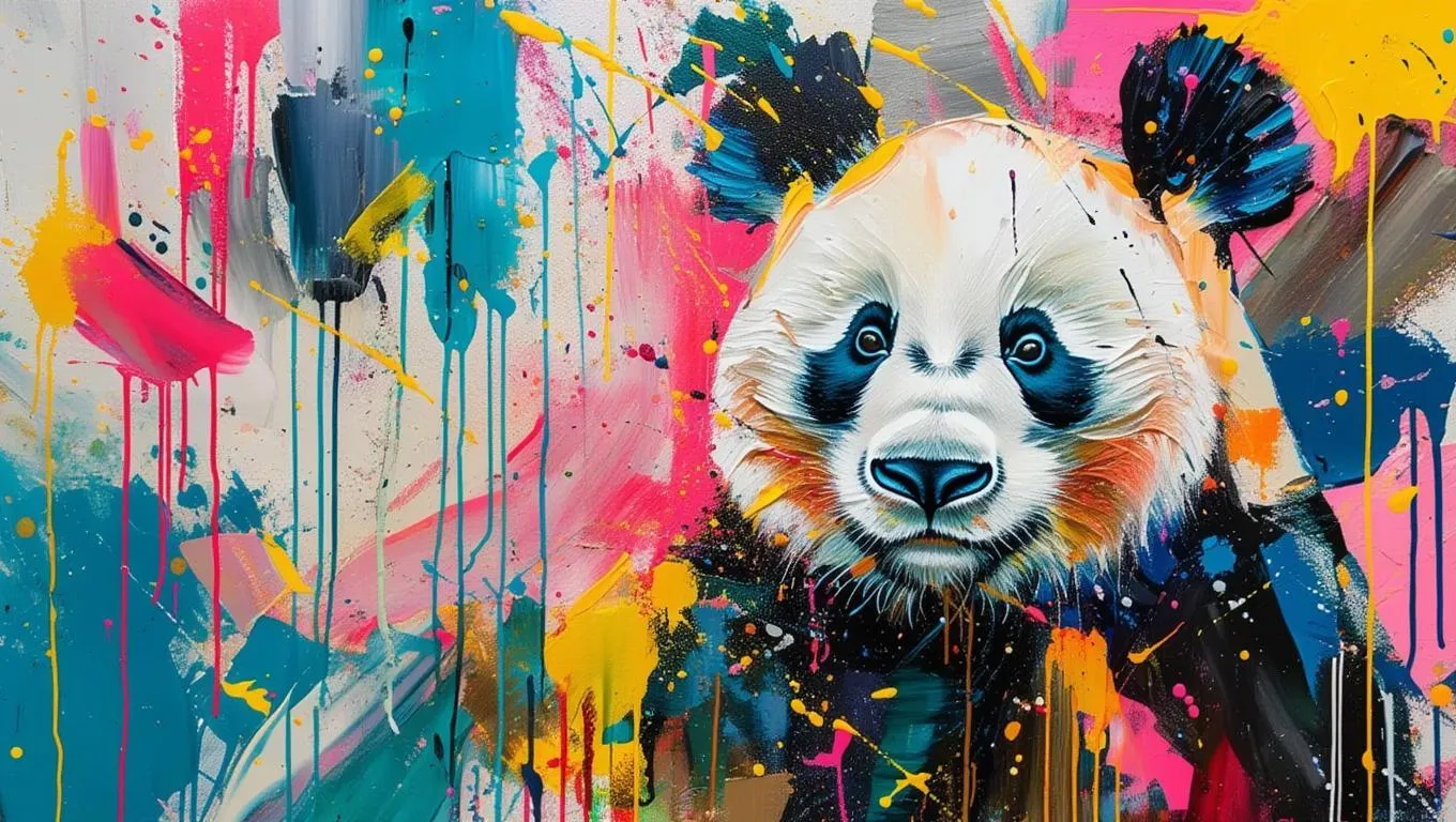 Create a vibrant AI-generated abstract panda painting blending Jackson Pollock's dynamic drips and Willem de Kooning's bold expressionism. Explore energetic textures, vivid contrasts, and modern artistry with AI image generator tools for unique, contemporary creativity. Perfect for digital art enthusiasts.
