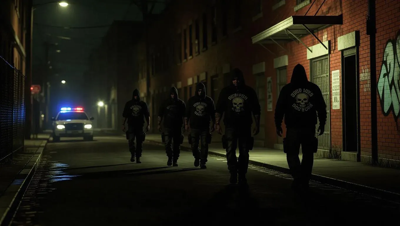 GTA-style dinner with a gang of tattooed and hooded bikers walking menacingly along a dark and deserted street in a seedy neighborhood, with abandoned buildings and graffiti on the walls, while a police car slowly passes in the distance; all shot with a low and dynamic camera angle, with a wide-angle lens, to emphasize the feeling of tension and danger.