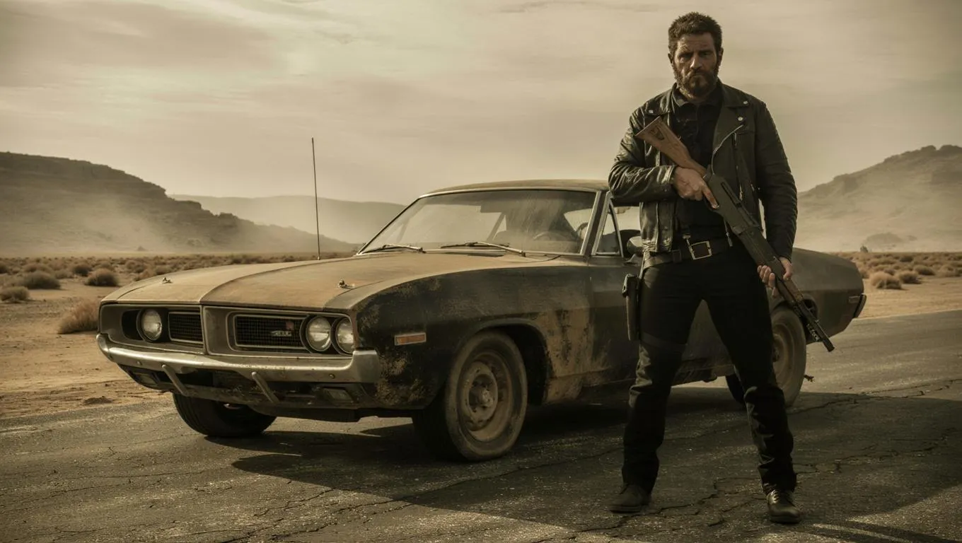 Generate stunning Mad Max-inspired post-apocalyptic scenes with vivago.ai. Craft AI images of a man holding a shotgun on a desert road outside a car. Use advanced AI effects and editing tools for professional-grade dystopian visuals from text prompts.