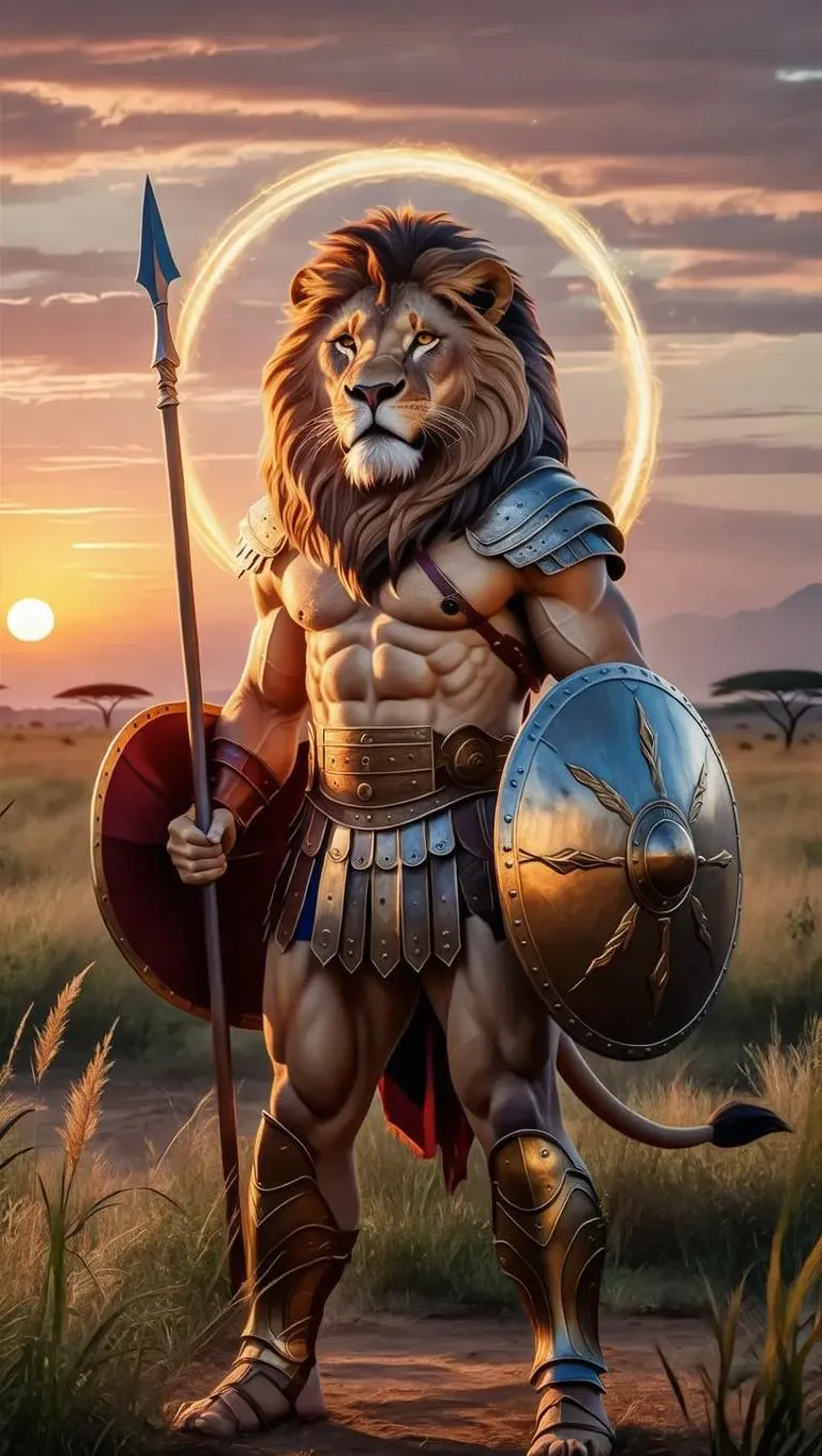 Generate a majestic lion gladiator with Roman armor in the African savannah sunset using AI. Vivago.ai crafts humanoid lions wielding spears and shields, blending muscular anatomy with golden skies and tall grass for striking warrior imagery. Ideal for fantasy art, digital storytelling, and epic AI-generated visual content.