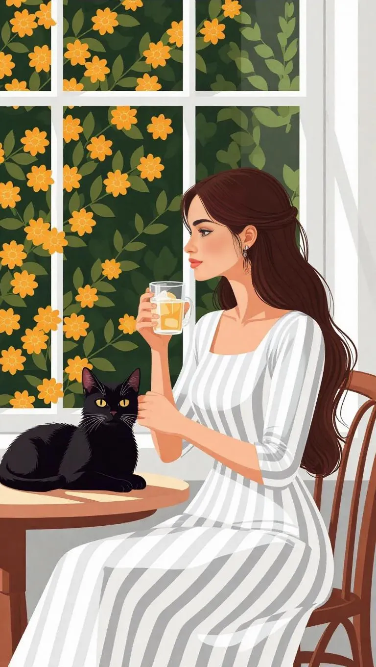 Pure white bakery, elegant black cat lounging by the window, gorse flowers blooming outside, woman sipping iced tea, adorned in a white and gray vertical striped dress, illustration style, exuding girlish charm and serenity.