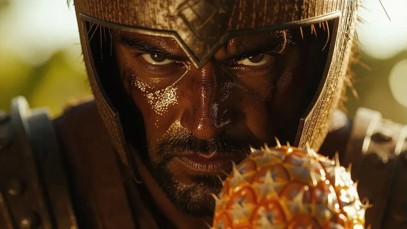 Create AI-generated warrior art with dynamic battle scenes using Vivago.ai. Craft striking characters like coconut-helmet soldiers hurling pineapple grenades against scarred landscapes. Our AI tools transform text prompts into professional-grade visual effects for cinematic action imagery. Ideal for concept artists and digital creators.