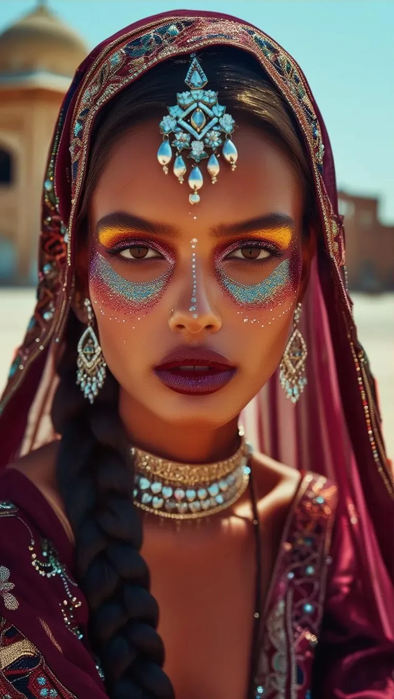 Ultrarealistic AI-generated portrait of a futuristic Mughal-inspired alien tribe with diamond skin, glittering lipstick, and X-ray print effects. Features braided hair, cutwork embroidery face, maroon jeweled attire, and surreal facial symmetry. Fujifilm analog film aesthetics, 16k resolution, wide-angle view, and vibrant cosmic city backdrop. Transform prompts into pro visuals with Vivago.ai's AI image tools for avant-garde digital artistry.