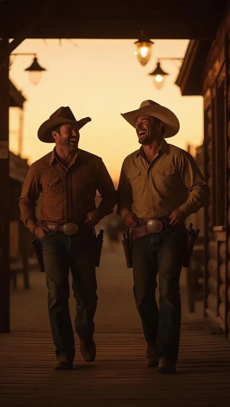 Transform text into cinematic Western scenes with vivago.ai's AI image generator. Craft vintage-style visuals of two cowboys laughing outside a saloon at twilight. Generate wide shots with warm orange skies, authentic period details, and soft film grain for professional-grade Wild West storytelling.