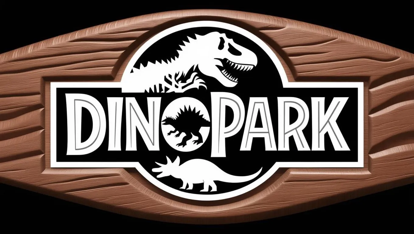 Create a bold Jurassic Park-inspired 'Dinopark' logo with AI. Features carved wood-textured typography, integrated dinosaur silhouette, and sleek black background. Modern, iconic design balancing white-gray tones for a dramatic, professional dinosaur park aesthetic. AI-generated visuals ensure striking, balanced typography and textured, carved-out effects.