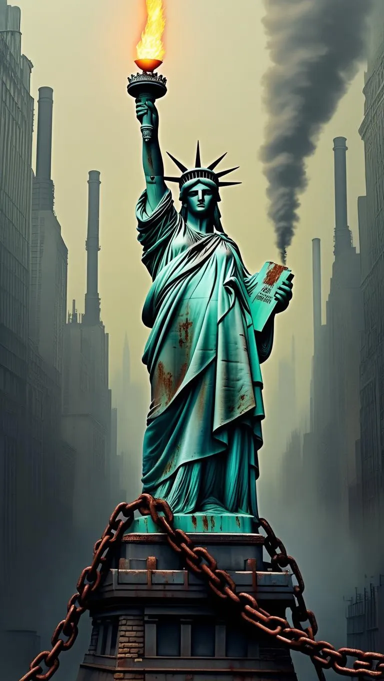 Create a dystopian Statue of Liberty AI image with gritty visuals and symbolic storytelling. Generate shackled freedom symbols, industrial cityscapes, and high-contrast despair-to-hope contrasts using Vivago.ai's text-to-image tools. Perfect for dystopian art, political commentary, or conceptual projects with professional-grade AI effects and editing.