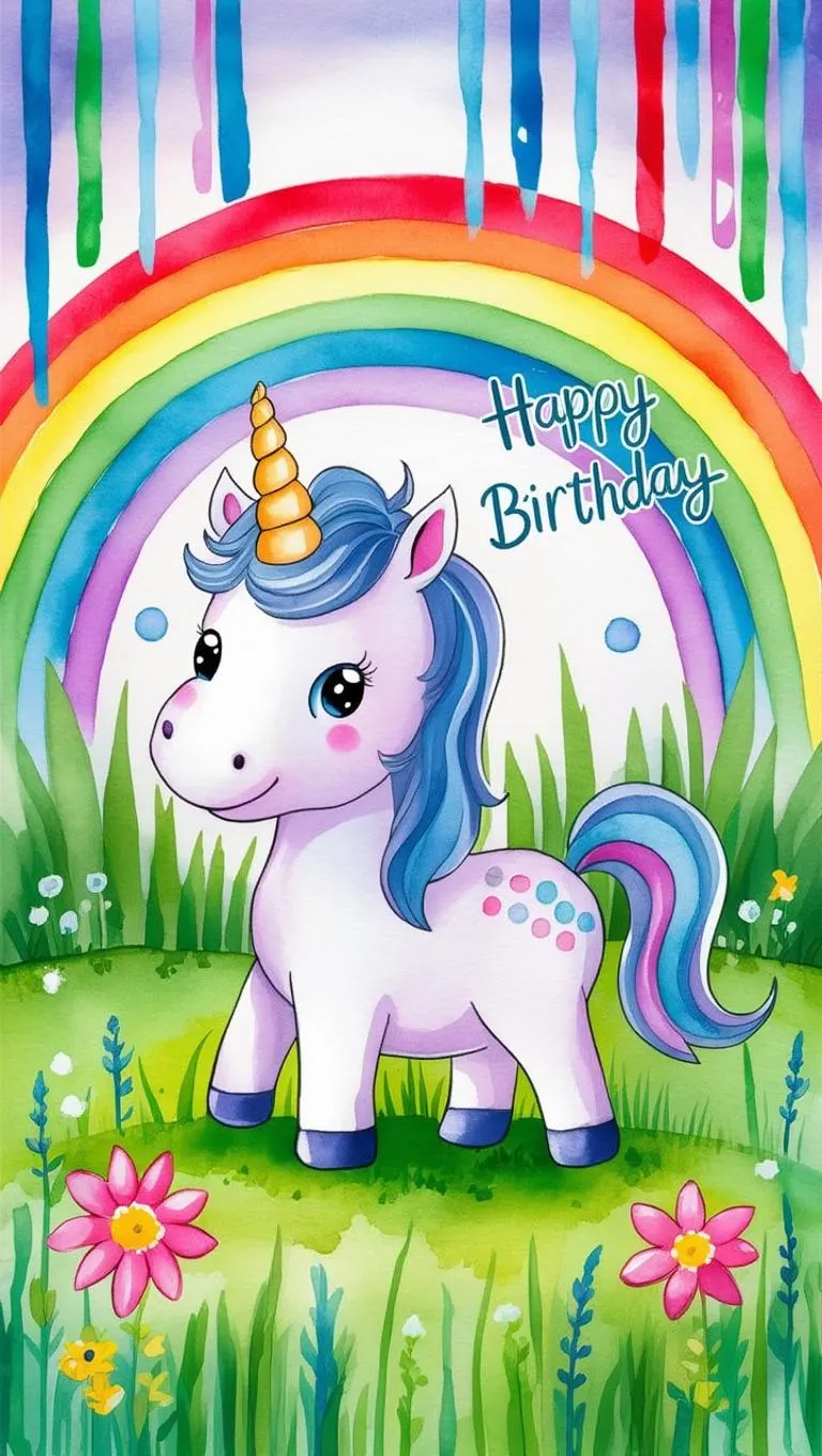 Create a whimsical AI-generated unicorn birthday card with vibrant watercolor effects, floral meadows, and rainbow backgrounds. Featuring playful "Happy Birthday" typography, Game-Style aesthetics, and Cloisonne Blue accents for eye-catching, professional-grade designs. Perfect for personalized celebrations. Explore vivago.ai's AI tools for stunning, creative visuals.
