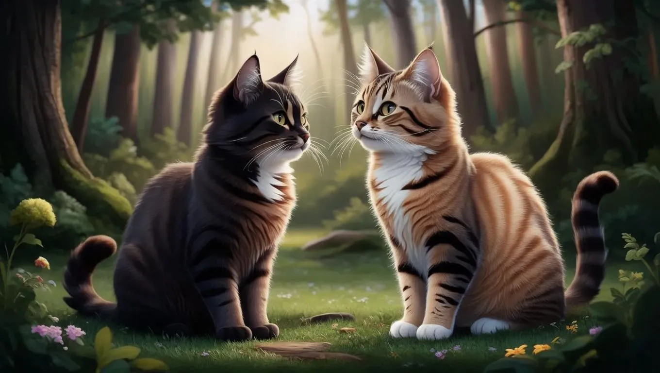Create AI-generated images of two close feline friends, a black and brown cat, in a mystical forest. Use vivago.ai's advanced AI art tools for vivid storytelling, lifelike visuals, and professional-grade effects to bring your imaginative narratives to life.