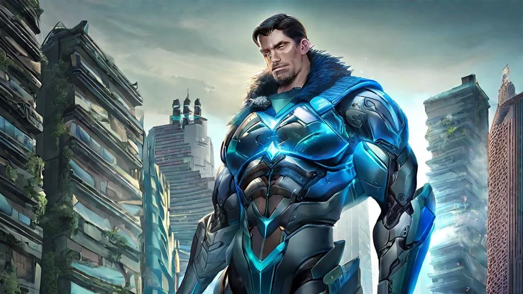 Generate hyperrealistic AI art of a muscular male android monkey in titanium armor with neon geometric designs, wearing a weathered green hooded cloak. Set against a dystopian futurist city, dynamic symmetry and indoor lighting highlight floating neon-blue patterns. Perfect for sci-fi enthusiasts, powered by VivaGo.ai's advanced AI creative tools for professional-grade imagery.