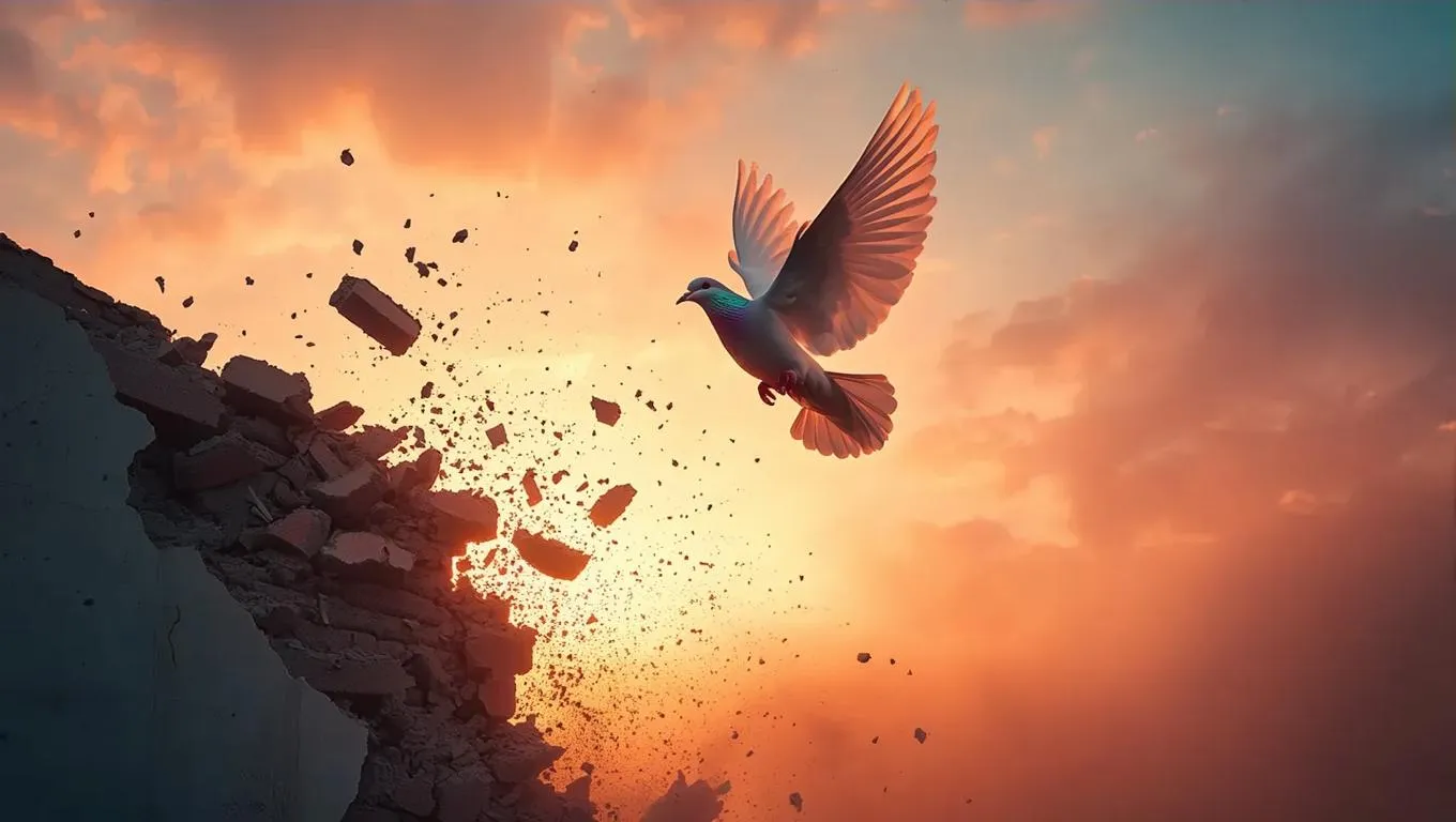 Capture a cinematic low-angle shot of a dove soaring from a shattered wall, debris cascading as dusk's orange-pink sky illuminates dust particles. Emphasizing vertical freedom, this hyperrealistic scene features a backlit silhouette, intricate feather details, and volumetric mist with a soft glow. Perfect for Hollywood-style visuals and poetic realism in AI-generated content.