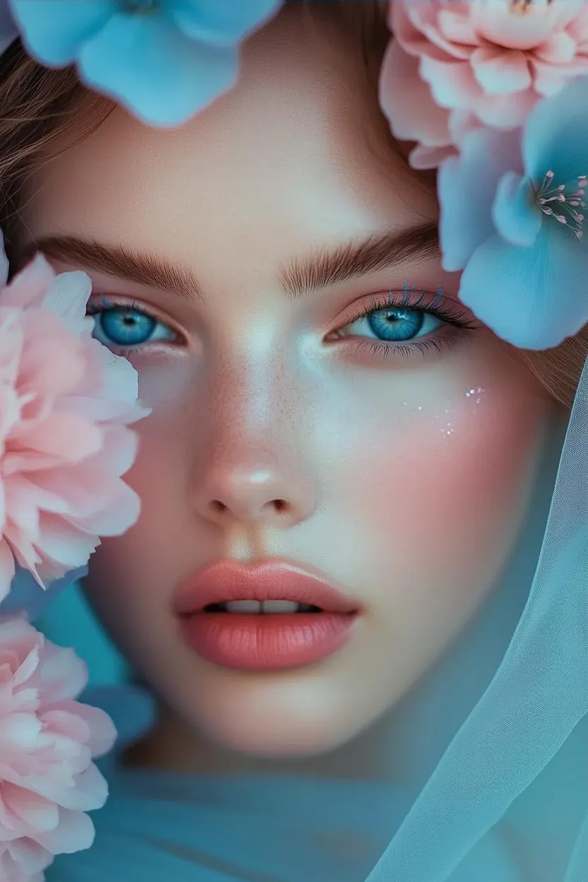 Create ethereal AI portraits with bluish-pink flowers and light blue veils using VivaGo's AI image generator. Craft artistic, stylized visuals in pastel tones for fashion photography, magazine covers, and fairy-tale illustrations. Generate professional-grade ethereal imagery with delicate makeup and dreamy aesthetics.