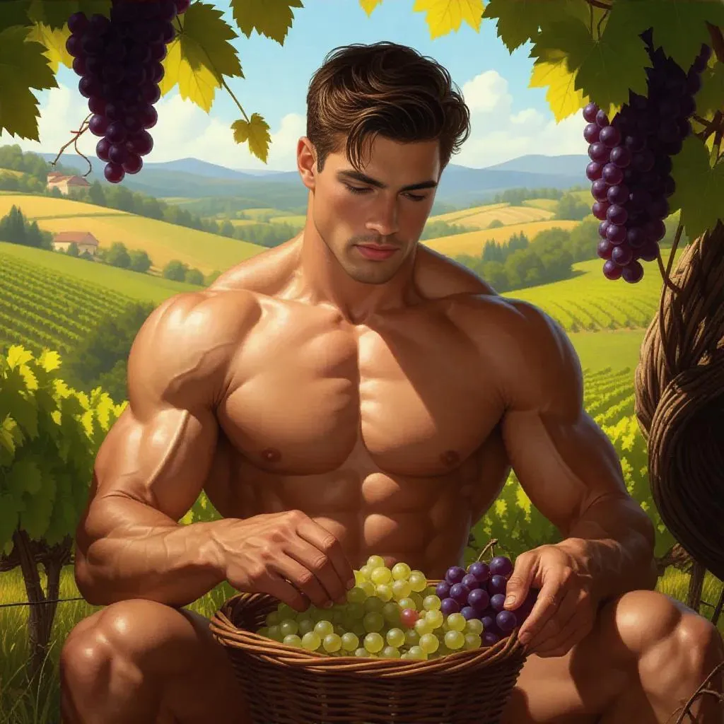 AI-generated digital painting depicting a serene vineyard scene with a muscular, shirtless man focused on vibrant grapes. Realistic style with a painterly touch, warm lighting, and front-view composition highlights pastoral beauty and intricate details of rolling hills, grapevines, and golden hues.