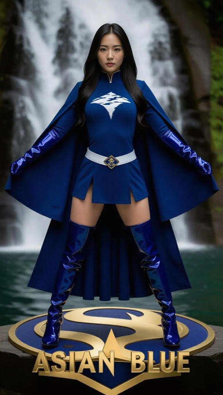 Generate stunning AI images of Asian superhero 'Blue Star' – a Chinese heroine in deep blue bodysuit with terrain emblem, cobalt gloves, cape, and boots. Flying aerial shot with panoramic waterfall backdrop from Vivago.ai's AI art generator. Transform text prompts into detailed superhero visuals.