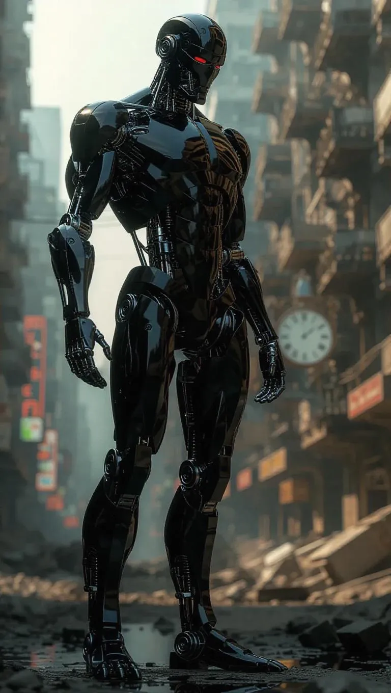 A dystopian future where a cyborg figure stands amidst a desolate urban landscape, embodying the resolve of steel and the flawless rhythm of sacred machinery. Flesh is frailty, soft and corruptible, while the cyborg’s metallic form remains unyielding. In the background, remnants of human civilization crumble, and a clockwork choir rises from the ashes, symbolizing the supremacy of mechanical perfection.