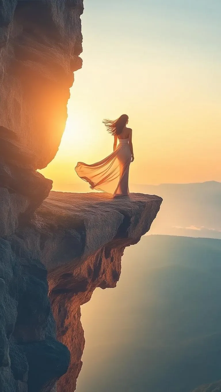 Generate an empowering AI image of a confident woman atop a cliff at sunrise, her wind-swept attire symbolizing strength. Bathed in golden light against a vast landscape, this scene embodies determination, self-belief, and limitless potential. Perfect for motivational content with Vivago.ai's AI image generator.