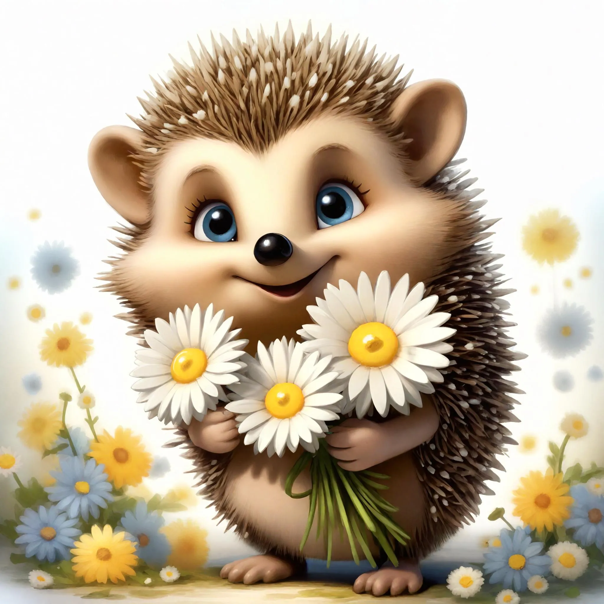 Create a Pixar-style cartoon hedgehog with hyperrealistic 3D animation, featuring spiky hair, expressive blue eyes, and a cheerful smile. This whimsical character holds vibrant daisies against a pristine background, blending playful charm with lifelike textures for professional AI-generated art. Ideal for animations, kids' content, or heartwarming visual storytelling.
