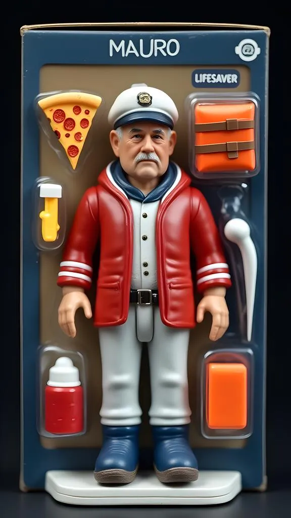 Rugged ship skipper action figure in weathered nautical gear, featuring vivid details—faded cap, Henry Lloyd jacket, steady gaze. Includes exclusive accessories: pizza slice, lifesaver, life jacket, each in individual blisters. Navy-blue card packaging with bold handwritten 'MAURO' atop. Realistic collectible display for nautical enthusiasts. AI-crafted design ensures premium, lifelike toy visualization.